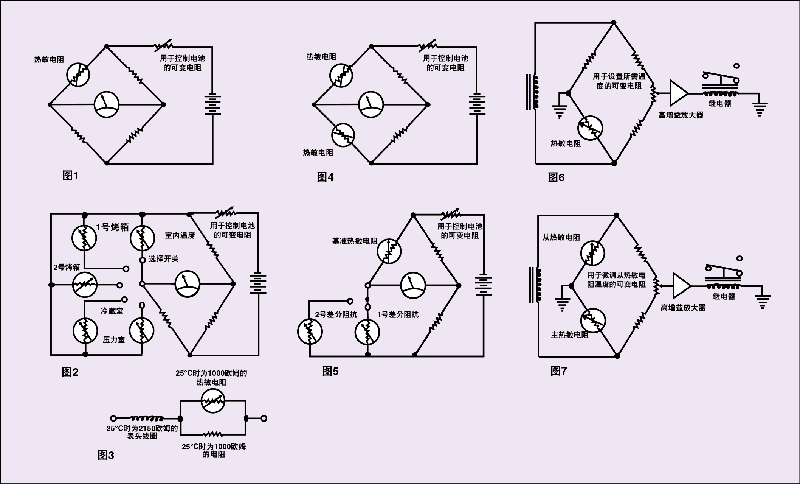 系统可以设计为,使用温度/电阻曲线已知的热敏电阻形成交流电桥的一个支路,并使用温度校准可变电阻形成另一个支路。当电阻设计为所需温度时,电桥将会产生不平衡。这种不平衡被送入一个放大器,该放大器启动继电器来提供热源或冷源。当热敏电阻感应到所需温度时,便会打开继电器并关闭热源或冷源,使电桥实现平衡。请参见图6。